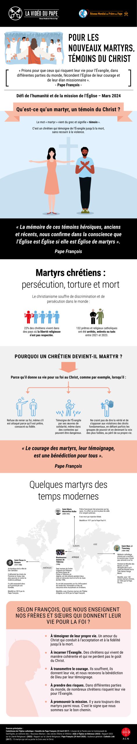 « Le courage des martyrs, leur témoignage, est une bénédiction pour tous », déclare le Saint-Père dans son message pour la Vidéo du Pape de mars 2024. Cette vidéo est promue par le Réseau Mondial de Prière du Pape et produite en collaboration avec Aide à l’Église en Détresse, dont la mission est d’aider les fidèles du monde entier partout où ils sont persécutés, opprimés ou dans une situation de détresse, par l’information, la prière et l’action.