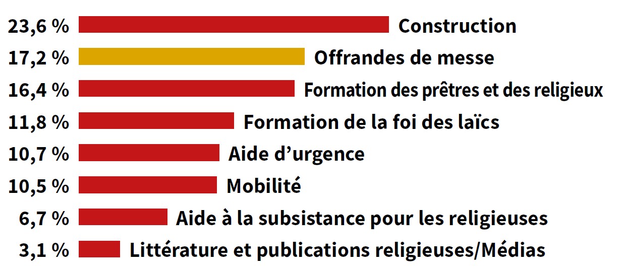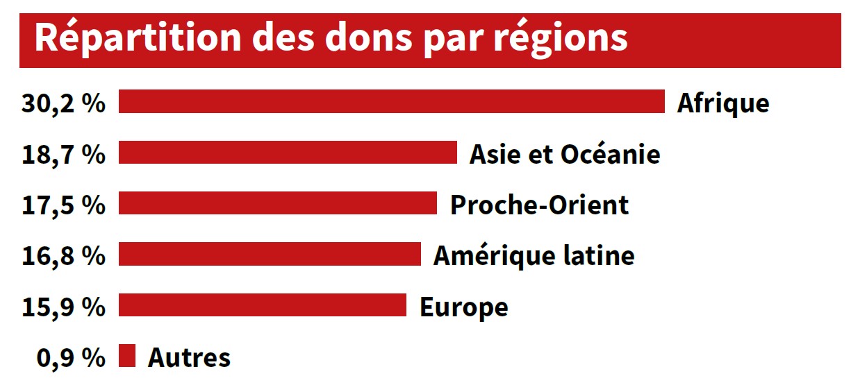 Le Moyen-Orient, avec 17,5 % de l’aide, est la troisième région la plus soutenue. Le Liban, la Syrie et la Terre Sainte sont les principaux bénéficiaires, après l’escalade des conflits armés. L’Amérique latine et l’Europe ont reçu respectivement 16,8 % et 15,9 % de l’aide totale. Les 0,9 % restants ont été alloués à d’autres régions.