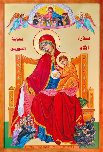 Carte de prière illustrée par l’icône ‘Notre-Dame des Douleurs – Consolatrice des Syriens’, qui a été bénie par le pape François le 15 septembre 2019 en vue d’effectuer une tournée dans les diocèses et les paroisses en Syrie comme une aube d’espoir apportant la paix et le réconfort pour les familles des victimes de la guerre, dans le cadre de la campagne de prière œcuménique intitulée « Soulagez mon peuple ».