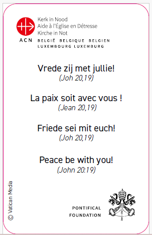 Dès son premier discours, le pape Léon XIV a mentionné l’importance de la paix. Il croit que la paix est en nous et si nous la partageons, la paix du monde émergera aussi. « Que la paix soit avec vous ! » (Jn 20,19) est au verso de cette carte avec la photo officielle du pape Léon XIV.