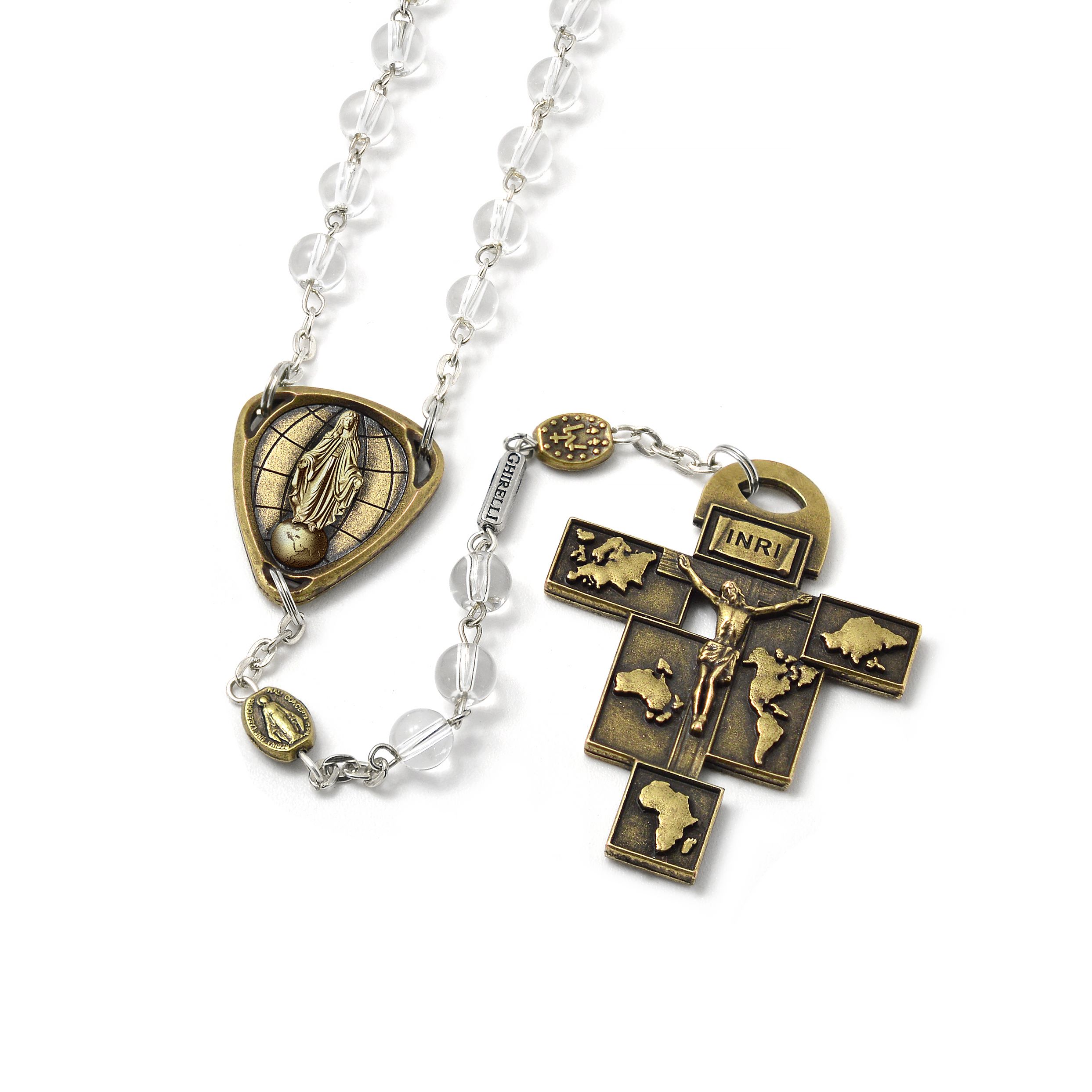 « Heureux les artisans de paix, car ils seront appelés fils de Dieu. » (Mt 5,9) figure au dos de la croix de ce chapelet afin de prier pour la paix dans le monde. La croix est entourée de tous les continents et dans le cœur se trouve Marie comme Reine de la Paix.