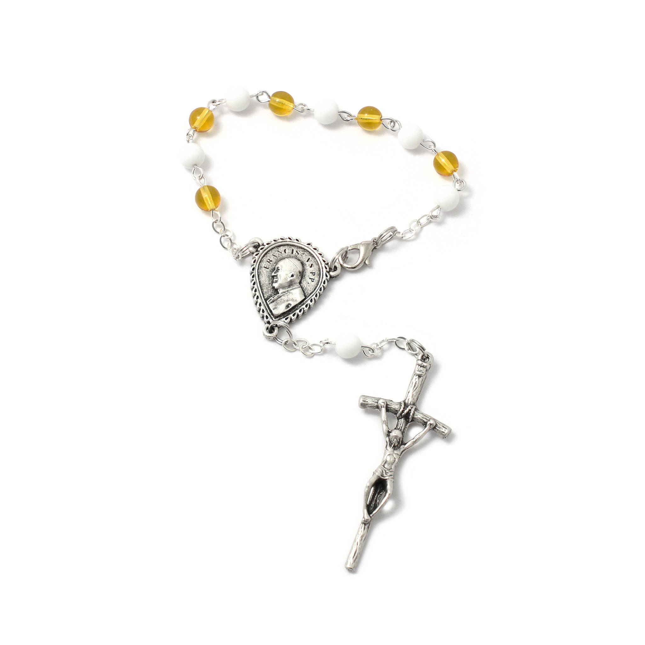 Vous cherchez un cadeau original pour un communiant ou un croyant qui prie ? Ce dizainier, orné de perles aux couleurs du pape (blanc et jaune), a été béni par le pape François.