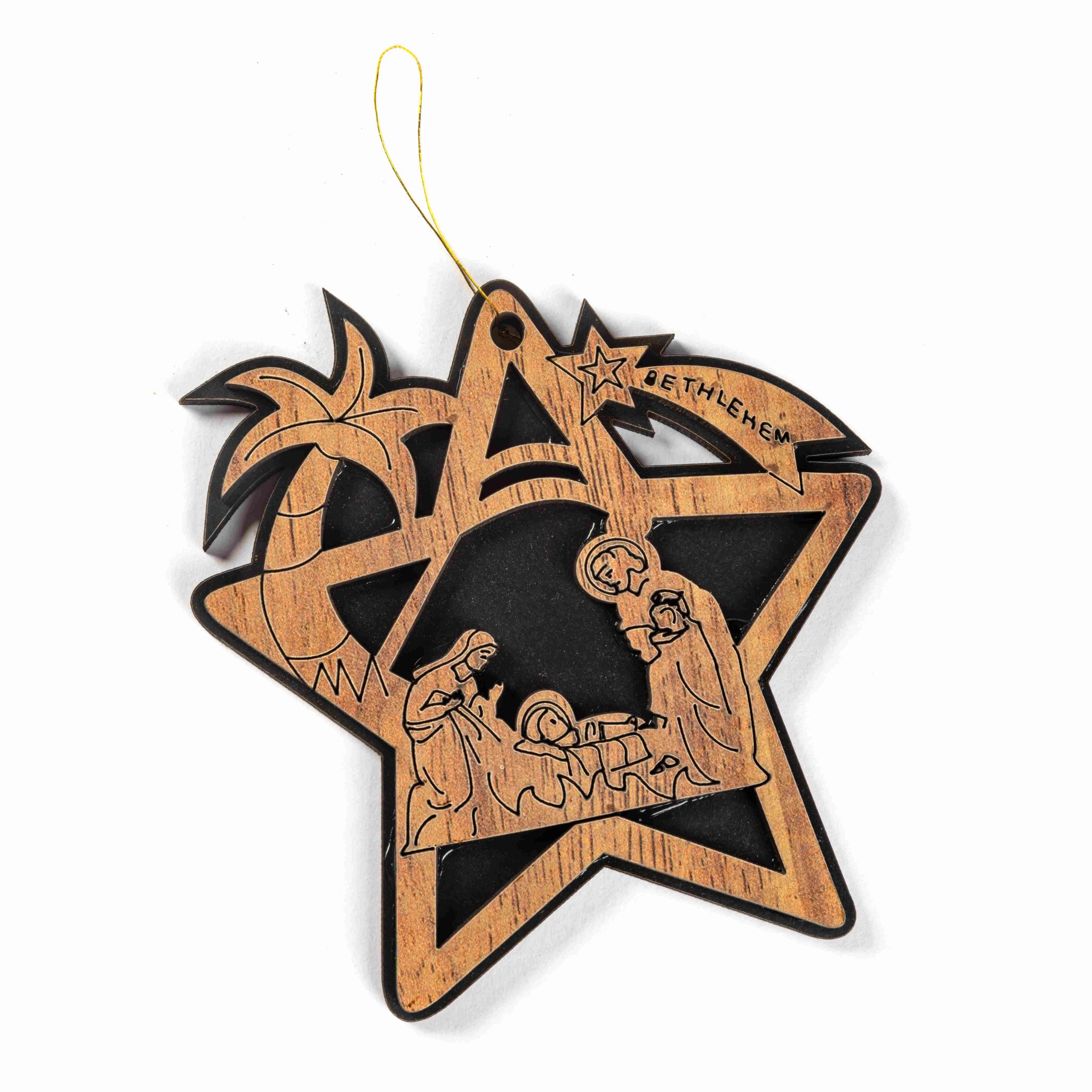 Pendentif de Noël en forme d’étoile en bois d’olivier avec Joseph, Marie et l’Enfant Jésus
